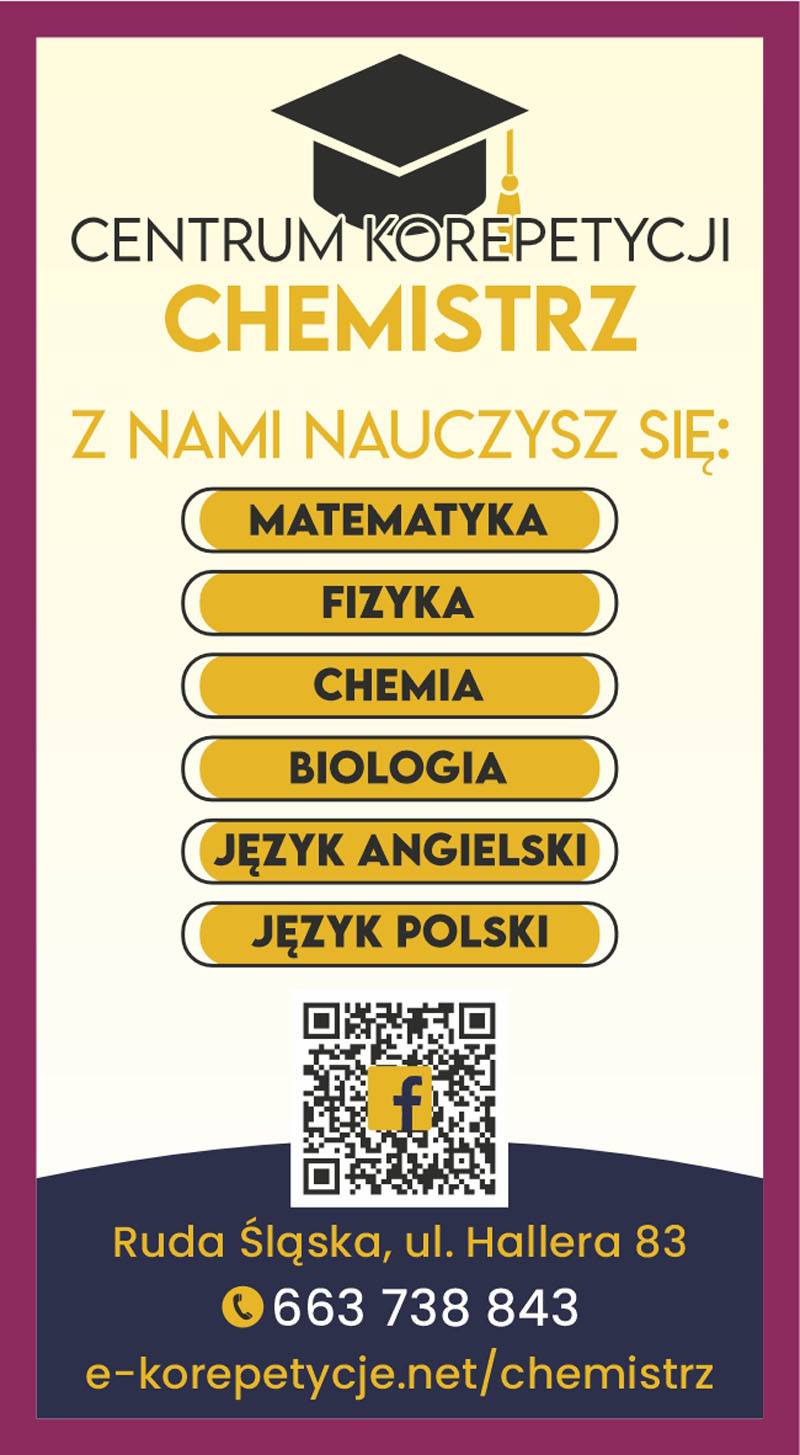 Centrum korepetycji CHEMISTRZ mieści się w Rudzie Śląskiej przy ulicy Hallera 83. Z nami nauczysz się przedmiotów szkolnych: język polski, matematyka, fizyka, chemia, biologia, język angielski.