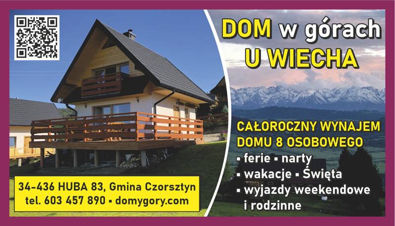 Zapraszamy do domku w górach u WIECHA w Hubie. Dom posiada dwie sypialnie na piętrze, a na parterze salon z kuchnią oraz łazienkę. Z tarasu rozciąga się piękny widok na Tatry. Dom przeznaczony dla ośmiu osób.