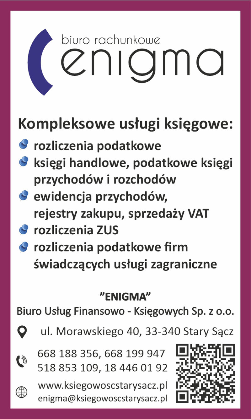 Biuro Usług Finansowo-Księgowych ENIGMA mieści się w Starym Sączu przy Ulicy Morawskiego 40.