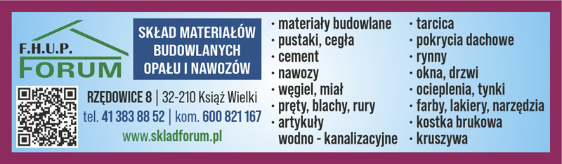 Skład materiałów budowlanych, opału i nawozów FORUM mieści się pod adresem Rzędowice 8, w gminie Książ Wielki.