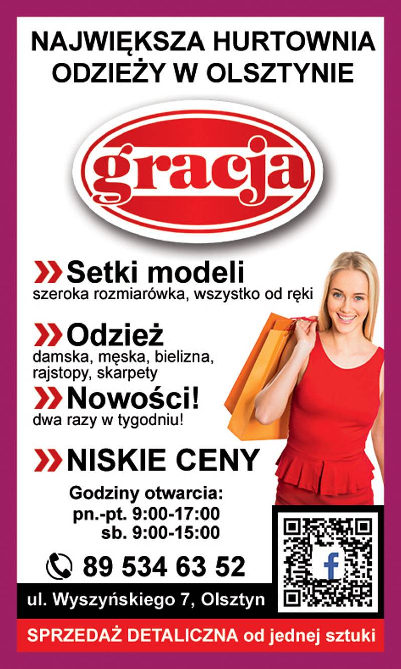 Hurtownia odzieży GRACJA mieści się w Olsztynie przy ulicy Wyszyńskiego 7. Oferujemy odzież damską, męska., bieliznę, rajstopy, skarpety. U nas setki modeli w szerokiej rozmiarówce. Dwa razy w tygodniu nowości. Możliwe zakupy detaliczne od jednej sztuki. Zapraszamy!