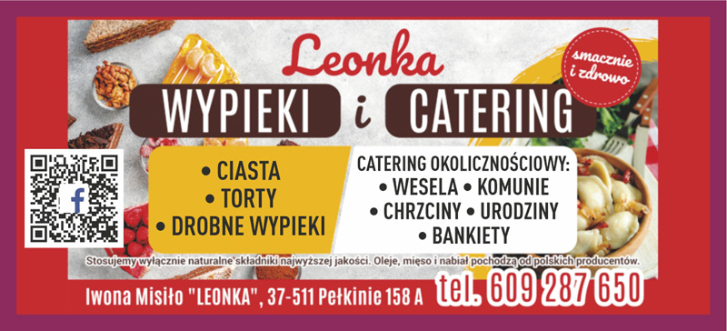 Firma LEONKA – Catering i Wypieki mieści się pod adresem Pełkinie 158 A, w powiecie jarosławskim. Stosujemy wyłącznie naturalne składniki najwyższej jakości. Oleje, mięso i nabiał pochodzą od polskich producentów.