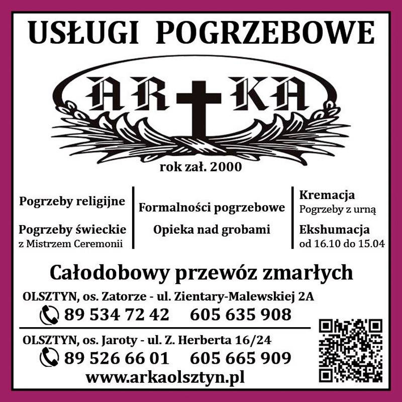 Zakład Pogrzebowy Arka powstał w Olsztynie jako odpowiedź na potrzeby licznych klientów, którzy oczekiwali wsparcia w kompleksowej organizacji ceremonii pogrzebowych. Firma prowadzona przez Annę i Elżbietę Michałowską oferuje najwyższej jakości usługi pogrzebowe, oddając do dyspozycji rodzin w żałobie kompetentny i życzliwy personel.